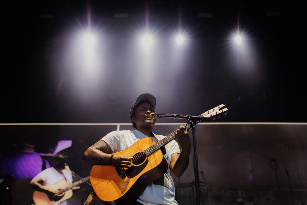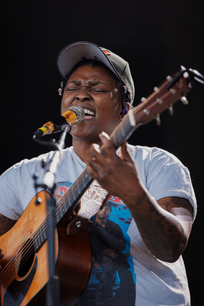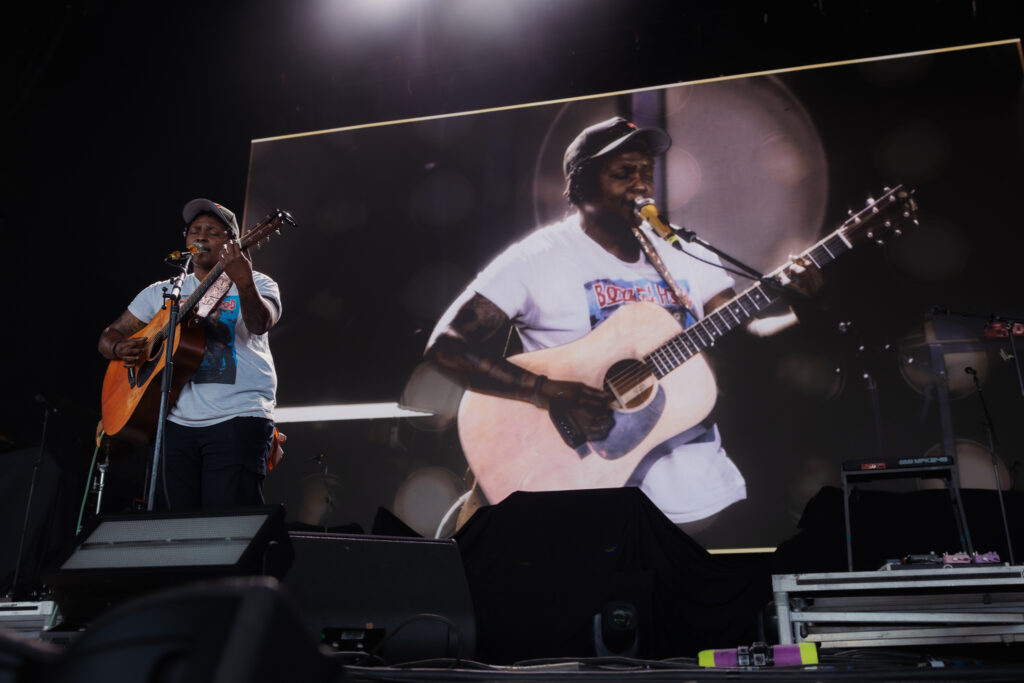 Then came Joy Oladokun, who completely changed the pace with an acoustic set after her band couldn’t make it across the border. Standing solo with her guitar, she filled the amphitheatre with warmth and grace. She mixed her own songs with covers of like the Beatles’ “Blackbird.” At one point, she paused to send love to trans folks: “you are loved,” drawing loud applause. It was the quietest set of the day but maybe the most powerful.