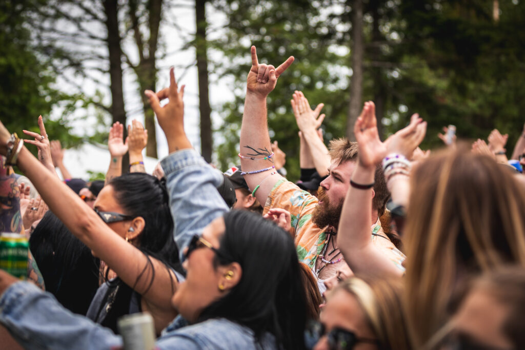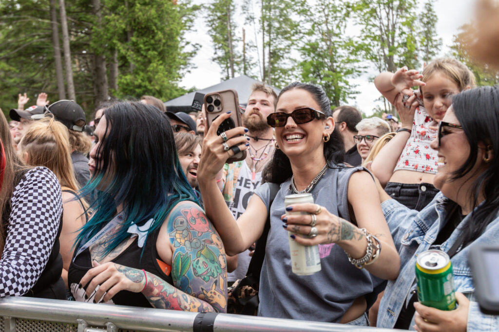 The festival grounds were packed early, with fans sporting vintage band tees, eyeliner, and studded belts. Groups of friends took turns snapping photos in front of a giant guitar sculpture by Briony Douglas, an art piece that fans can catch again at Boots and Hearts later this summer. It was a clear crowd favourite and a backdrop for more than a few group selfies and DIY photo shoots.