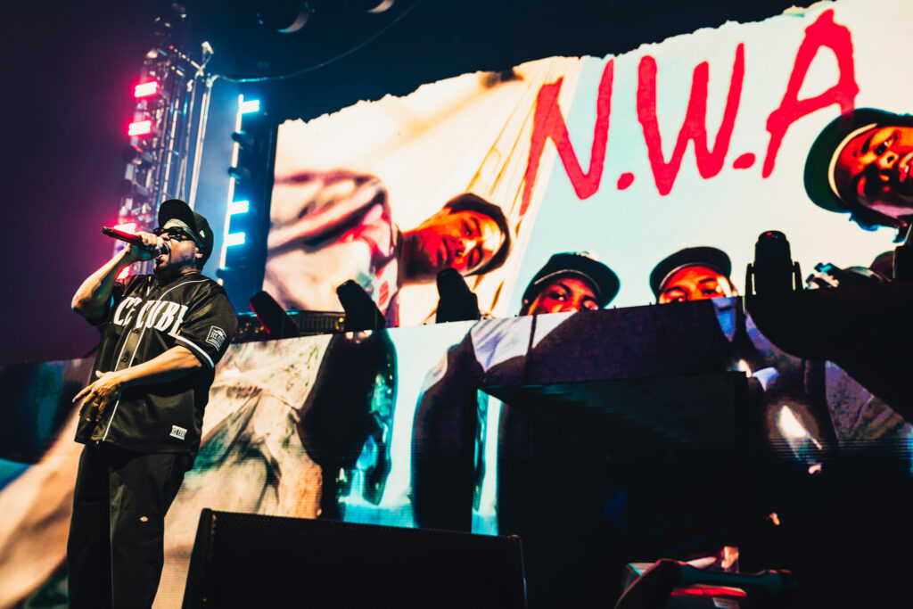 “Straight Outta Compton” closed out the N.W.A. portion of the night with a bang, wrapping up an opening run so electrifying it’s hard to fully capture without witnessing it yourself. After the track, Cube stepped offstage, and the screens lit up once more, this time taking fans through his journey into the 90s as he launched his solo career. The crowd lit up with smiles and nods, many reliving memories from the era as Cube’s story unfolded before them. When he returned, the arena erupted. Cube unleashed a string of classics, including “Once Upon a Time in the Projects,” “No Vaseline,” and “Check Yo’ Self”. As we reached 1994, Cube talked about how Eazy-E’s loos created sadness, and previous years were too wild. So he decided to write a film, Friday. The introduction led him to the performance of the track which triggered the brains of every audience member to dance. He included a small vignette dedicated to his friend, mentor, the late great John Singleton, who directed the hit film Boyz-N-The-Hood. It was a touching and honourable tribute.