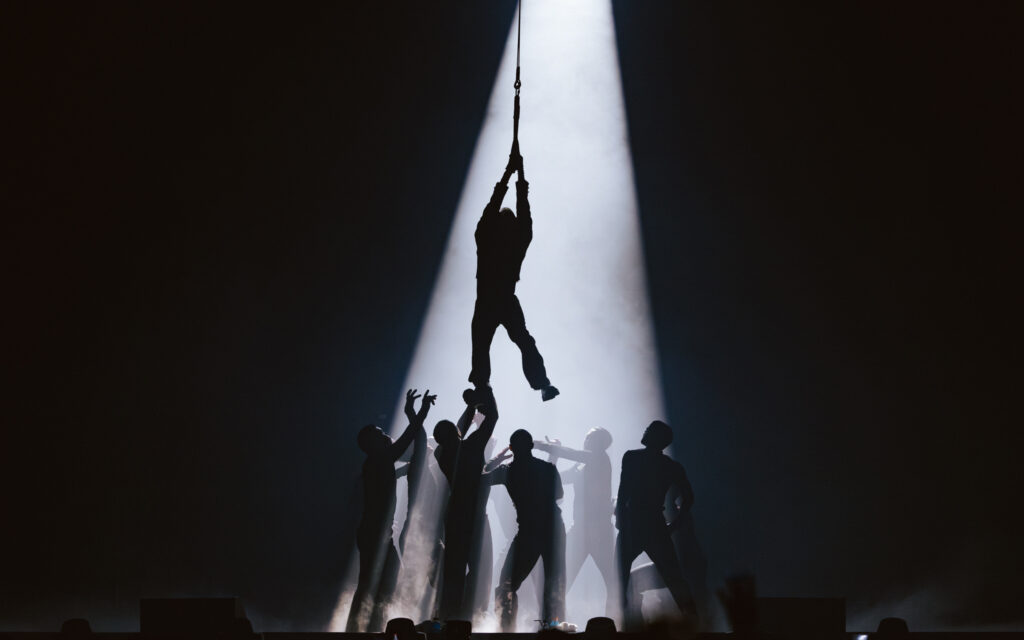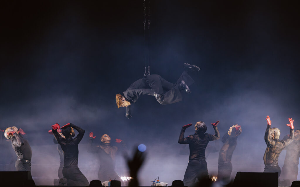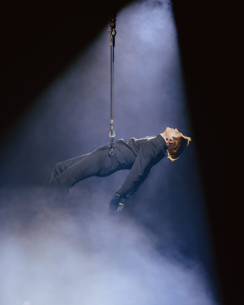 When the venue went dark, the screams were immediate ; the fans behind me already losing their voices. A cinematic intro played across the massive screens. The MAGICMAN II tour is structured almost like a film, divided into narrative arcs with video interludes bridging each section. Then Wang appeared, suspended mid-air on wires, a single spotlight cutting through the darkness. “High Alone” kicked off the night with him literally running in place above his dancers before descending to join them.