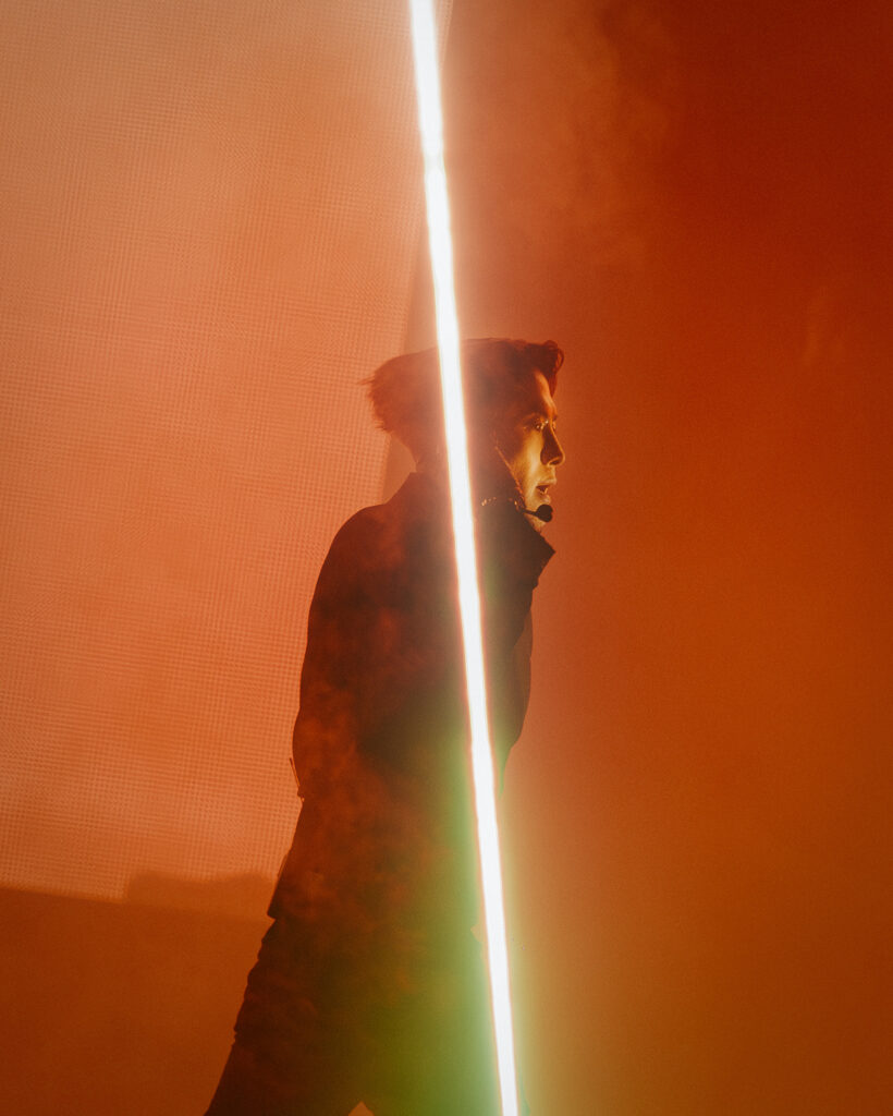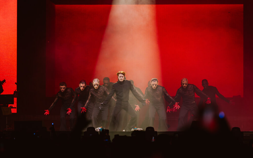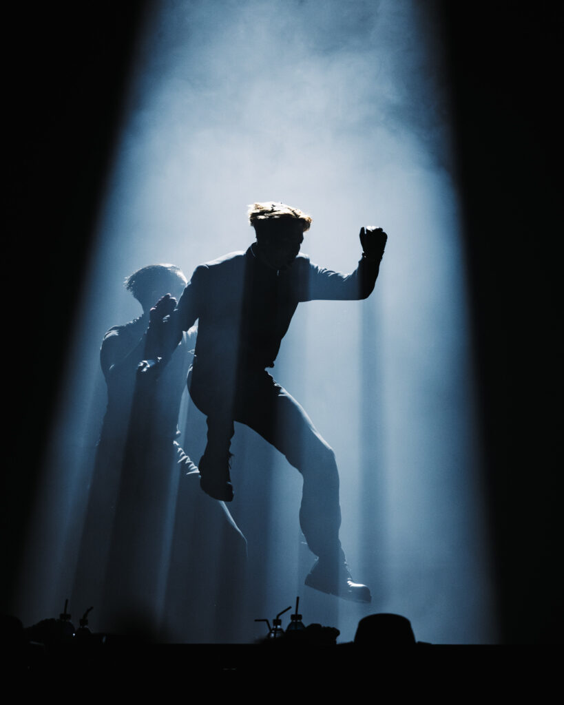 Another video interlude shifted the mood again. Onscreen, Wang appeared in crisis, drinking heavily, breaking down emotionally, his dark alter ego looming. When he returned to the stage in a loose, straitjacket-inspired white outfit, it was clear we’d entered the most introspective portion of the night. “Blue” and “Everything” hit hard, with dancers floating around him in slow, fluid movements. For “Dopamine,” he asked the audience to raise their phone (and finger) flashlights. It was genuinely beautiful.