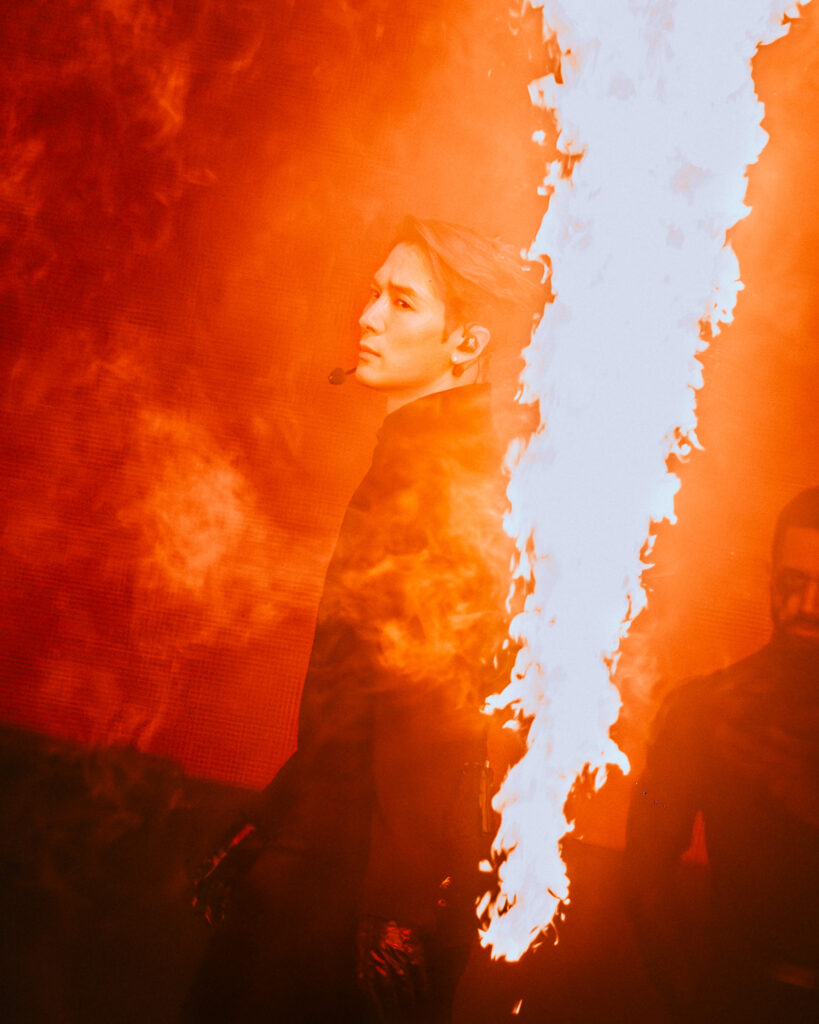 From there, the production only intensified. “Access” brought flames shooting from the stage, deep red lighting washing over the arena, and dancers in black with matching dark eye makeup mirroring Wang‘s MAGICMAN alter ego. The choreography was sharp, the atmosphere thick with smoke and lasers. It looked like a visual album brought to life in front of us.