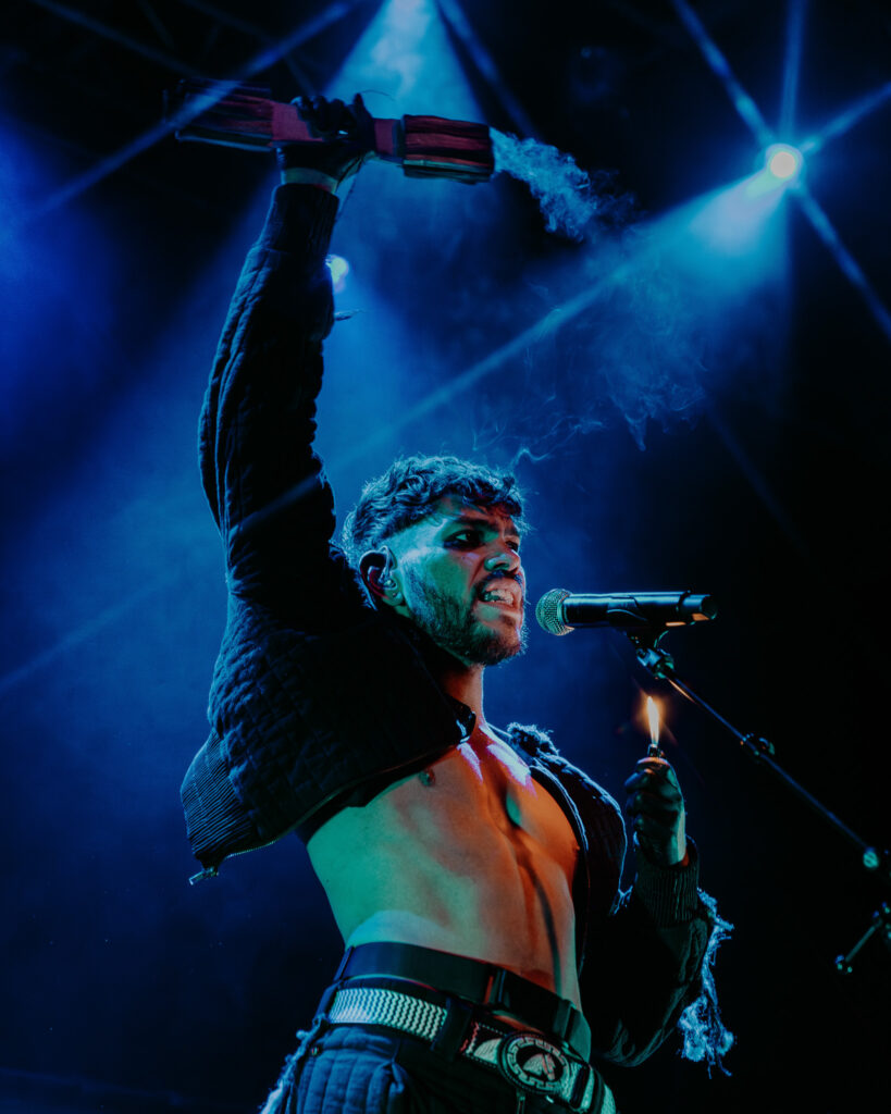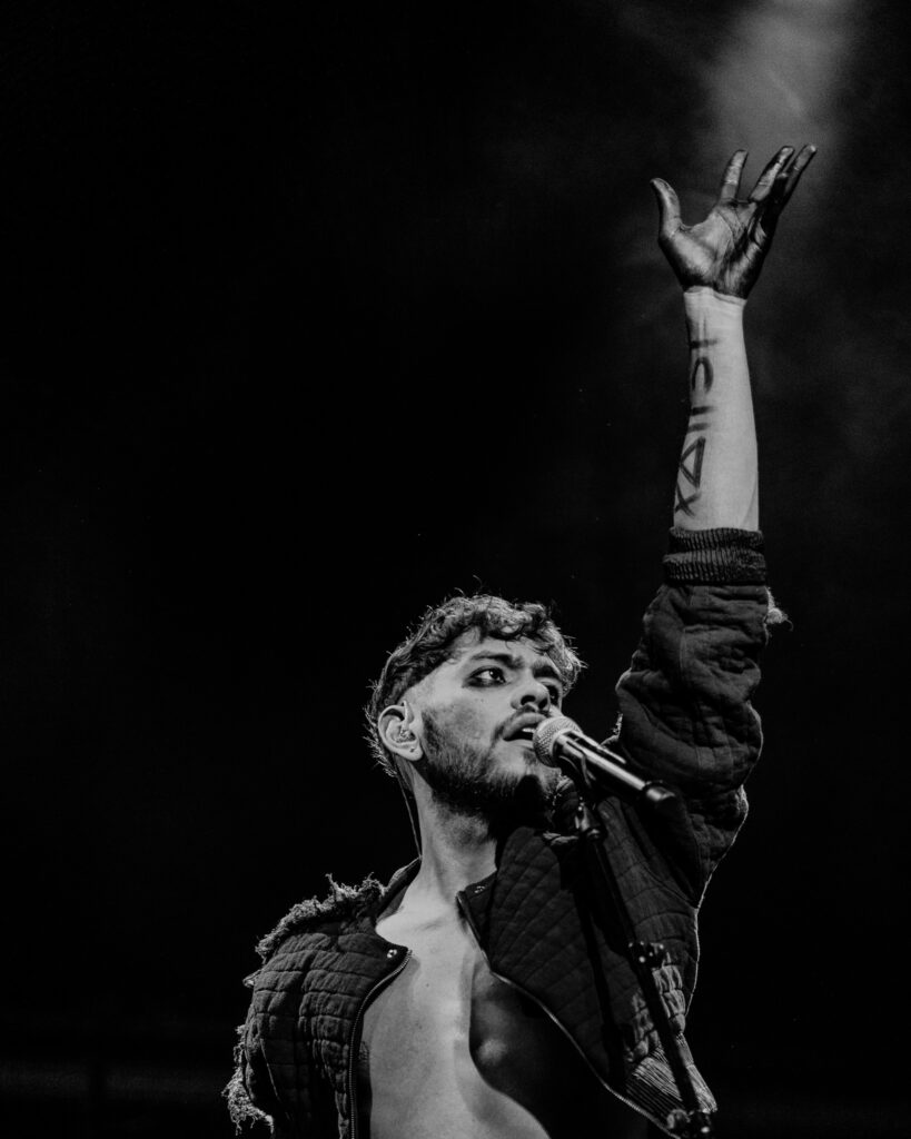 They open with “Lay Me Down,” nearly motionless beneath a single spotlight. Dressed in a structured captain’s hat and a sweeping lace coat fastened with an oversized flower pendant, they look like a romantic voyager arriving somewhere that already feels familiar. The first note is soft, almost cautious. Then it opens.