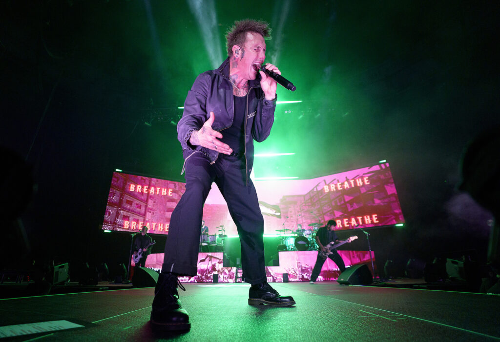 The middle of the set leaned into their emotional side. During “Falling Apart,” Shaddix talked openly about his history with suicidal thoughts and why speaking about mental health matters so much to him. It wasn’t preachy ; it felt like a human being leveling with a full arena. A short video on the screens followed, highlighting the Canadian phone line for suicide prevention. When the lights dimmed and Shaddix asked the crowd to raise their phone lights for “Leave a Light On (Talk Away the Dark),” the whole floor glowed white. It looked like a vigil. This band can swing from chaos to connection in seconds, and it always hits hard.