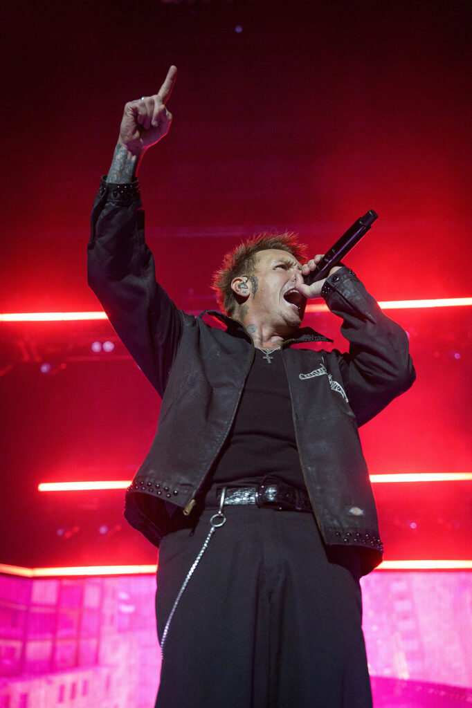Instead of easing into things, Papa Roach went for a full jumpscare. The house lights dropped, a massive curtain crashed down, and the band exploded into “Even If It Kills Me.” The pyro blasted, CO₂ shot into high, and the video walls behind them stitched together moody visuals that felt like a short film. It was bold and theatrical in a way that fits them now.