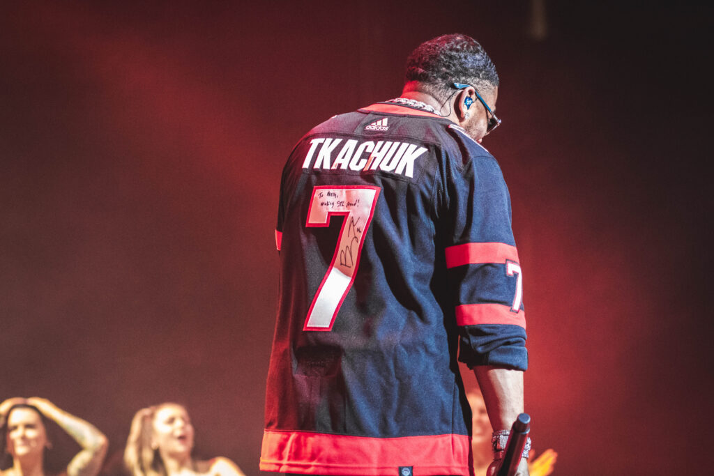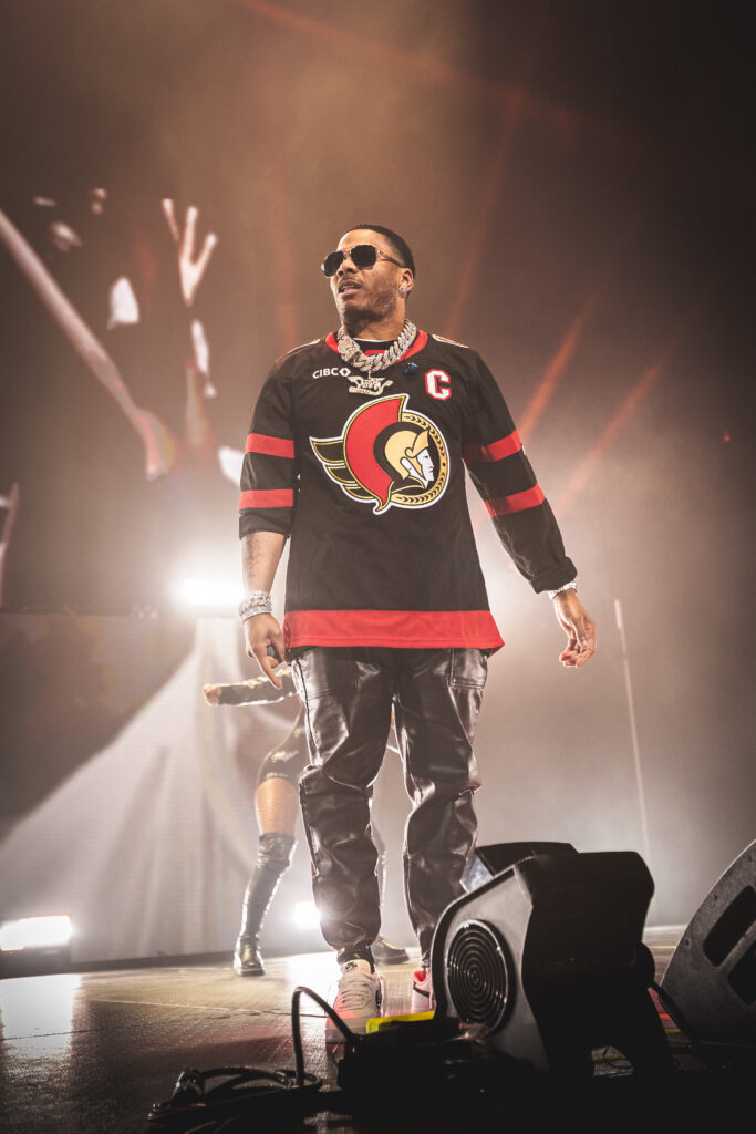 At 9:30 the stage was transformed into a nightclub for the headlining event. Dancers entered the stage followed by eight VIP guests, lucky enough to be on stage during Nelly’s set. Then out of the curtains ran out Nelly, wasting no time keeping the party going. To begin the night, Nelly wore an Ottawa Senators hockey jersey. Brady Tkachuk, the captain of the Senators, signed the jersey “To Nelly, making STL proud!” A great gesture by Tkachuk and the Senators organization.