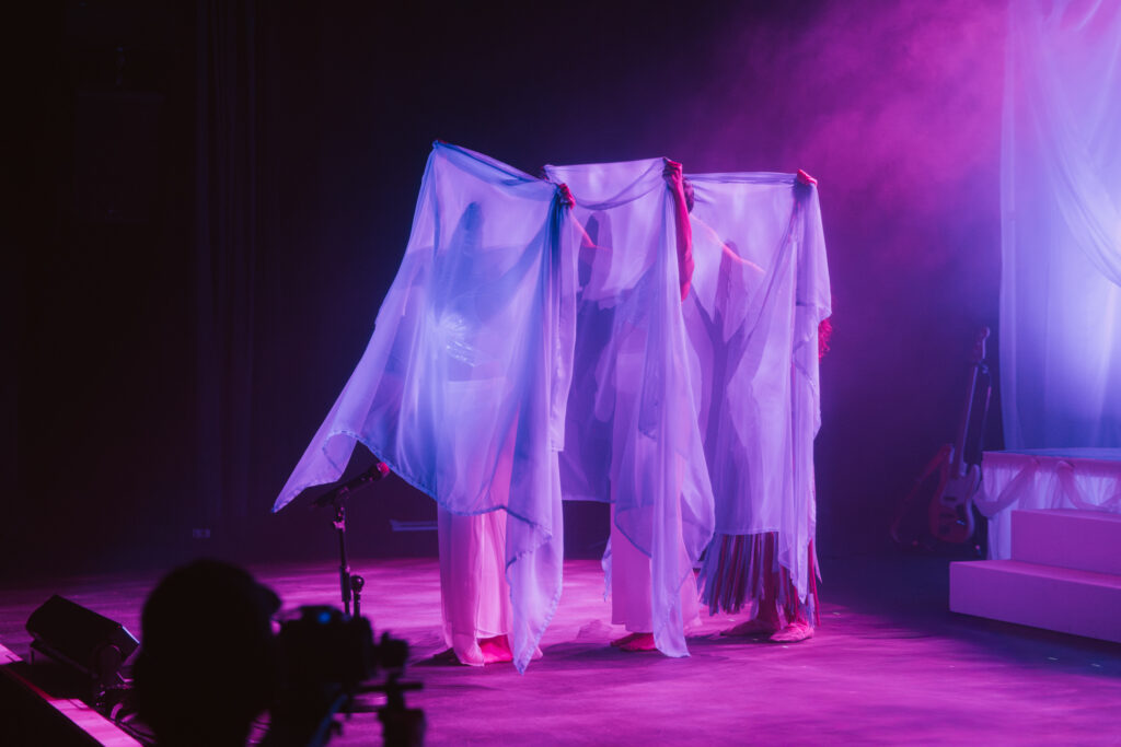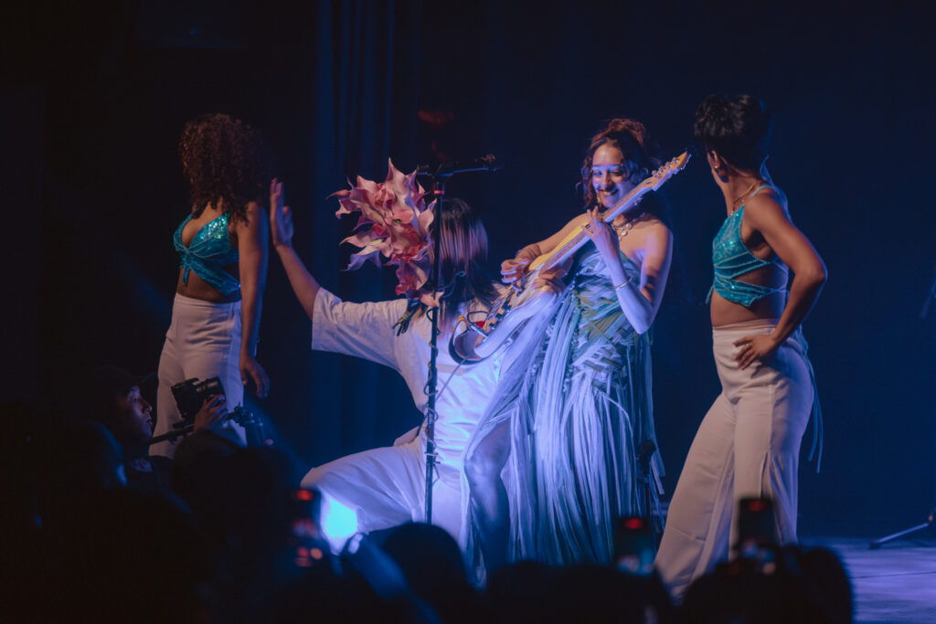 Around 9pm, the lights dimmed and soft keys signaled Raveena’s entrance. Raveena, dressed in a flowing blue-greenish gown, and her two dancers moved gracefully across the stage, carrying flowing sheets of fabric. Hidden behind them, they slowly emerged, dancing in time with the music before stepping fully into view. She opened het set with ” We Should Move Somewhere Beautiful” and “Pluto.”