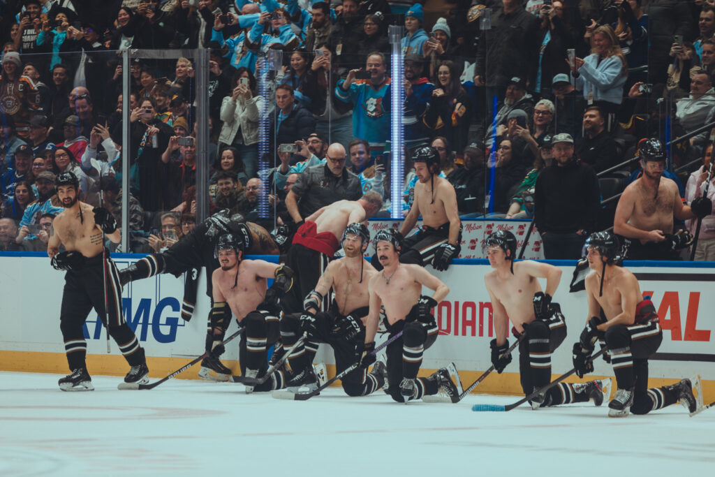 The format kept things loose with two periods only. A staged fight closed the first period and drew the lone “penalty” of the night. Before the second, a shootout added drama. When the Alumni team hit ten goals, the deal kicked in and the Shoresy boys’ shirts came off. The crowd clearly approved.